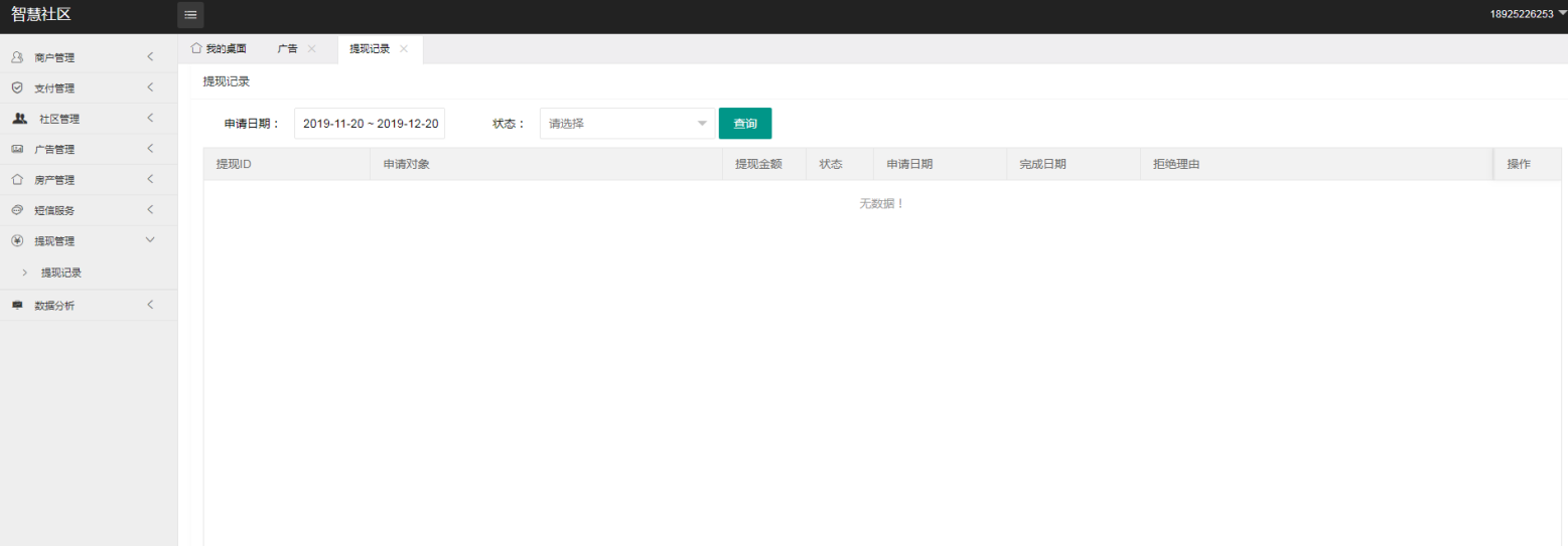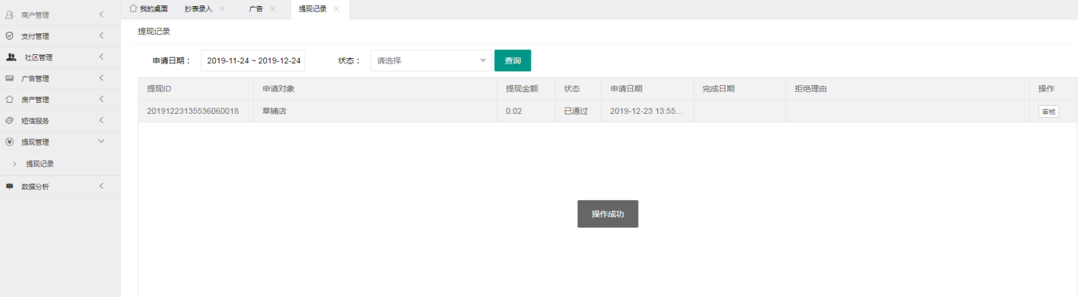 提現記錄是記錄該個賬號的提現情況,如:提現的訂單,賬號,金額以及審核等。如下圖所示: