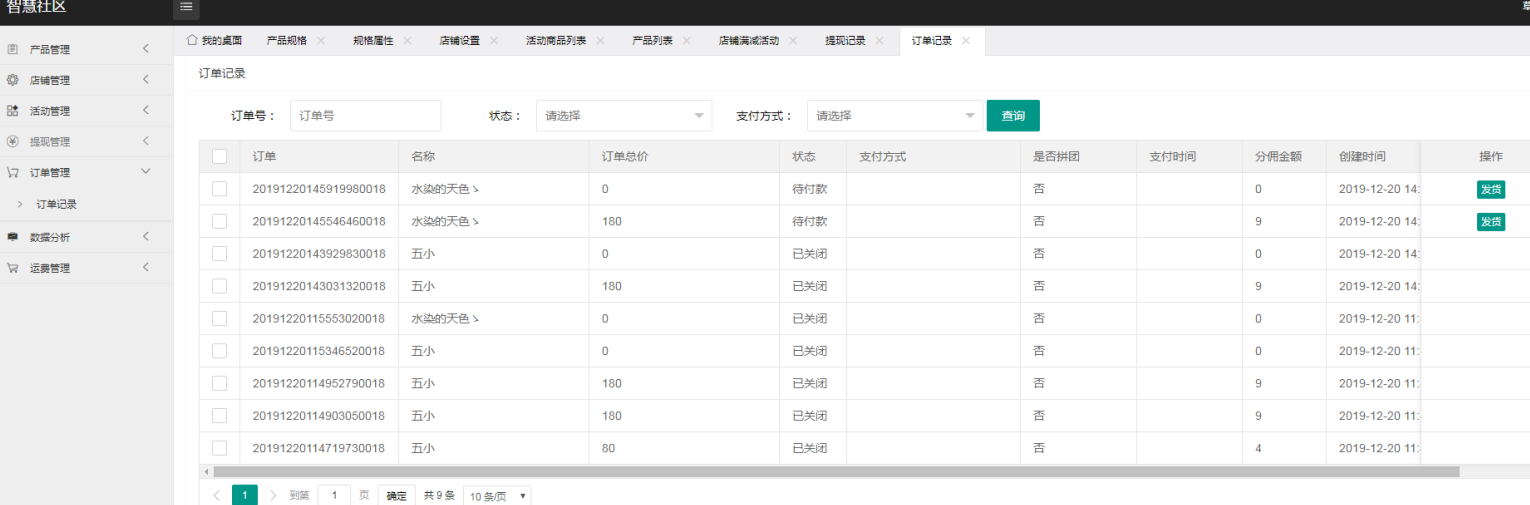 訂單管理是記錄這個店鋪訂單單號,用戶名稱,價格,支付狀態,分傭金額,是否發貨等訂單詳情。如下圖所示: