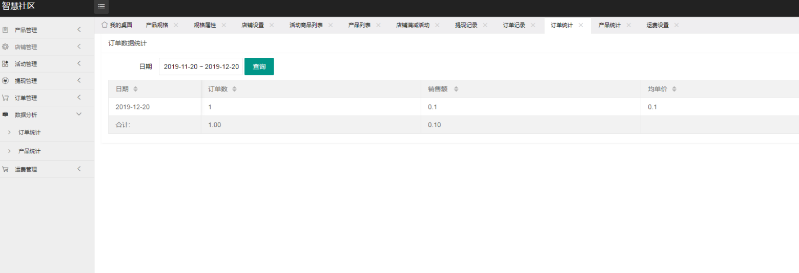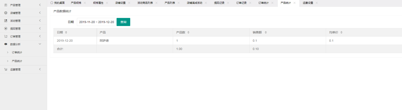 數據分析主要包括訂單統計和產品統計,訂單統計和產品統計都是要訂單發貨后才有記錄。如下圖所示: