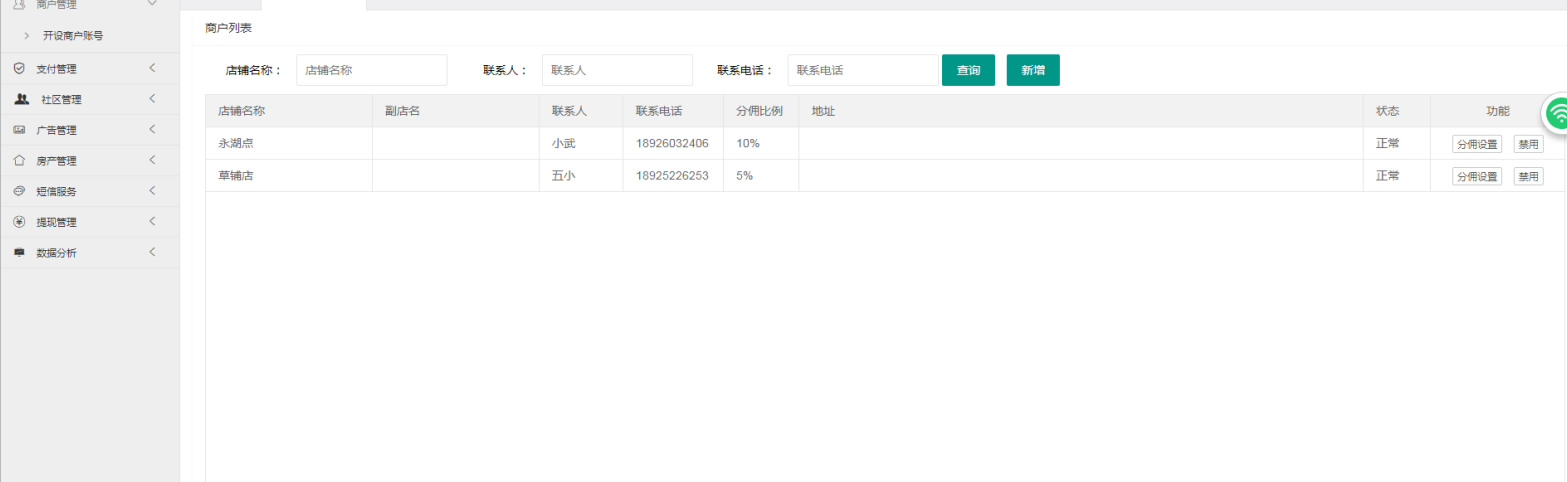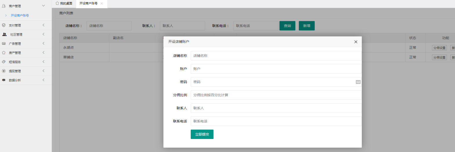 開設商戶賬號主要是對商戶賬號的增刪改查以及設置商戶分傭設置。如下所示: