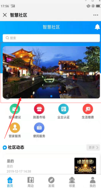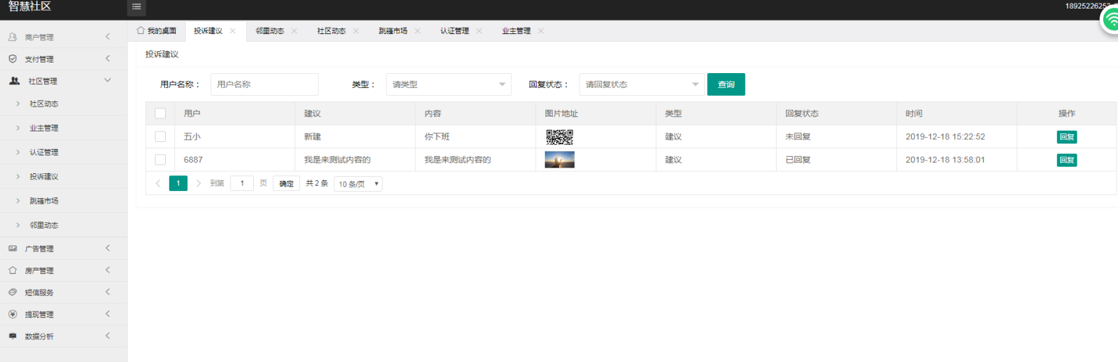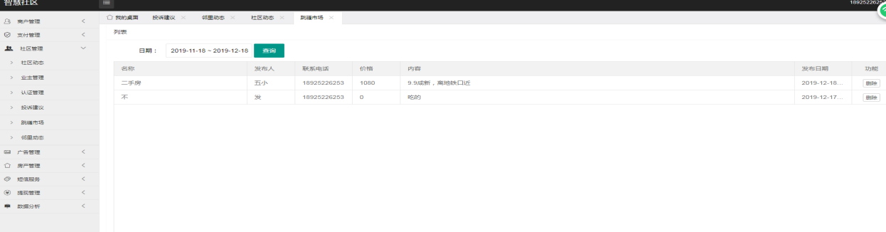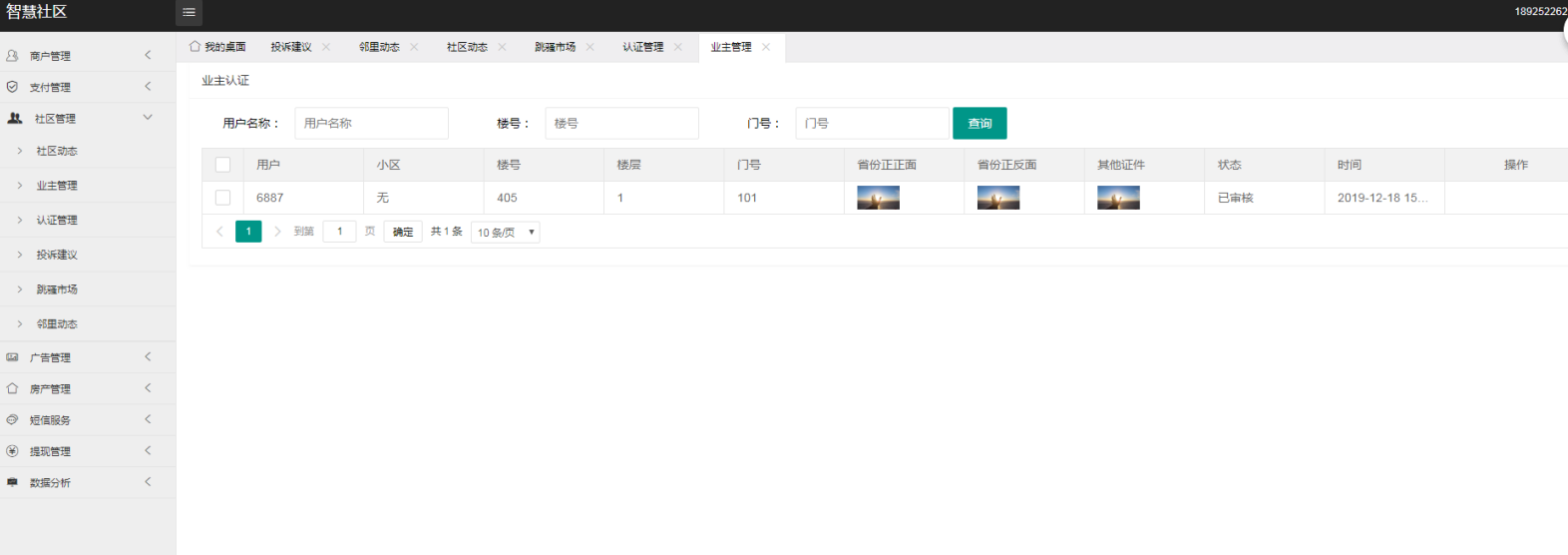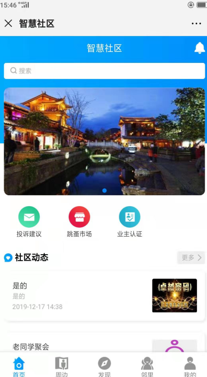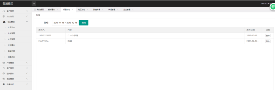 社區管理主要分為社區動態,業主管理,認證管理,投訴建議,跳蚤市場,鄰里動態。如下圖所示: