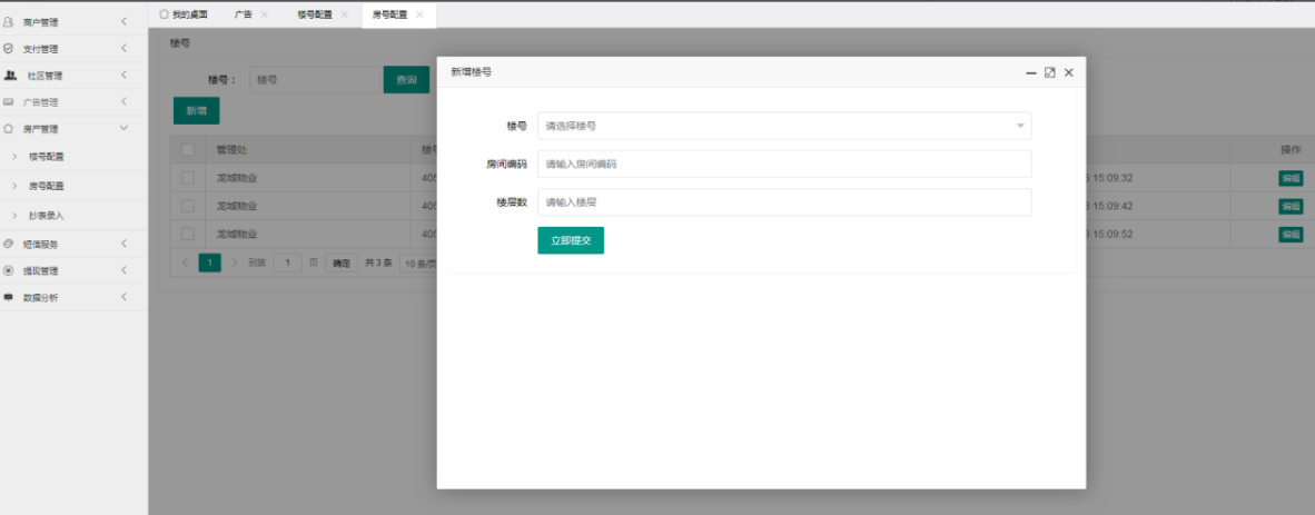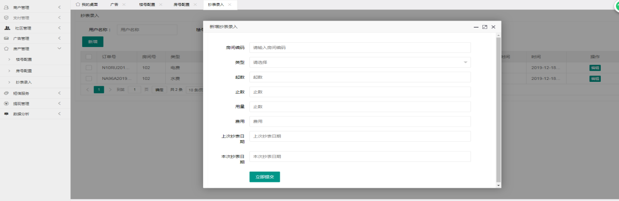 房產管理分為樓號配置,房號配置,抄表錄入等。如下圖所示: