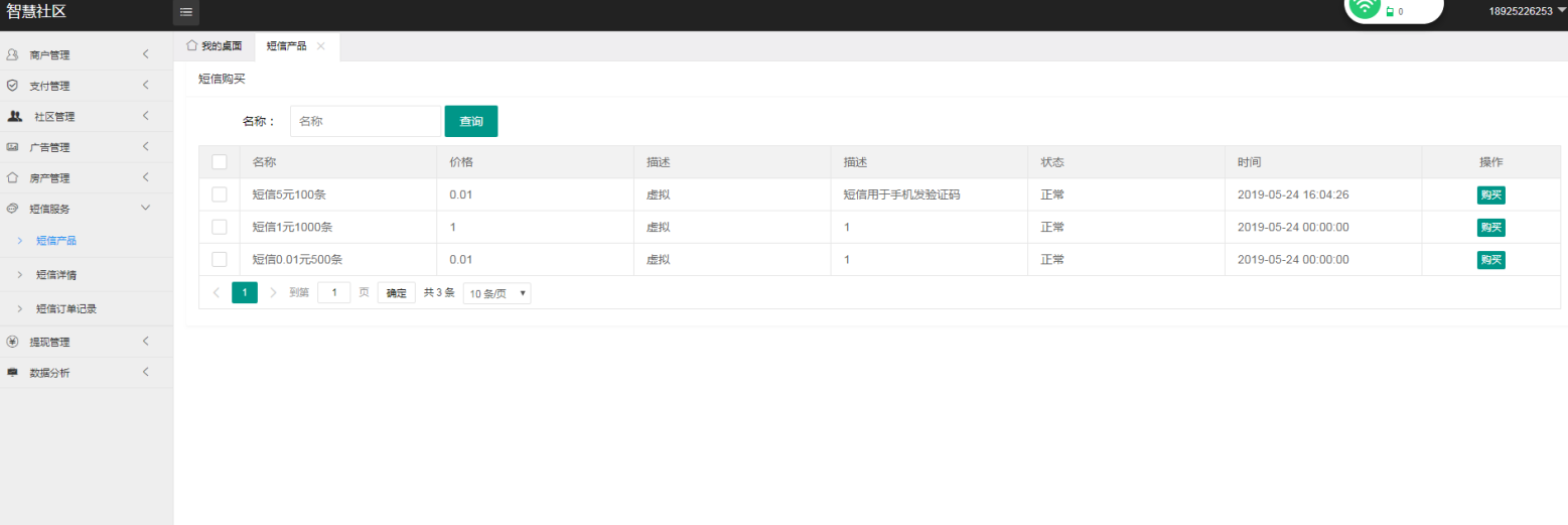 短信產品分為3種價格,不同的價格的產品數量不一樣,作用都是一樣,用于短信手機發驗證碼。如下圖所示: