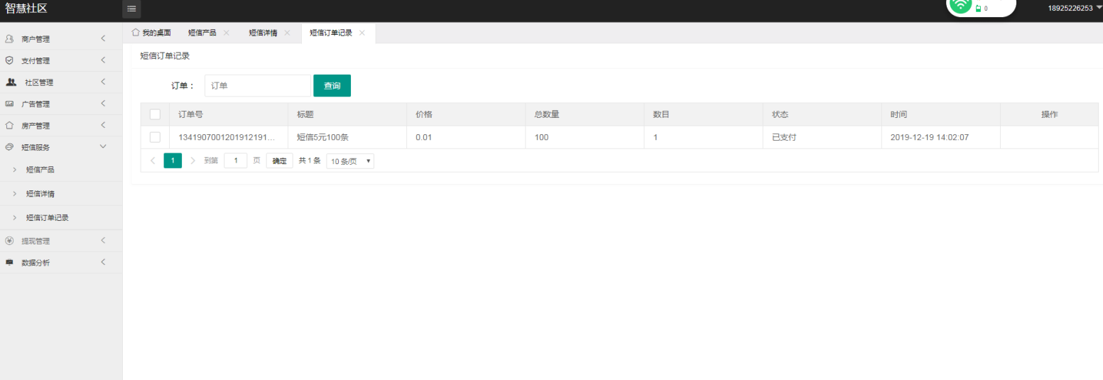 短信服務主要包括短信產品,短信詳情以及短信訂單記錄等。如下圖所示:
