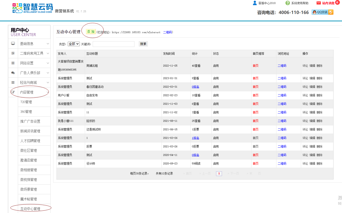 1、首先登陸智慧云碼系統(tǒng),找到內(nèi)容管理,打開互動中心管理,點擊添加,如下圖所示: