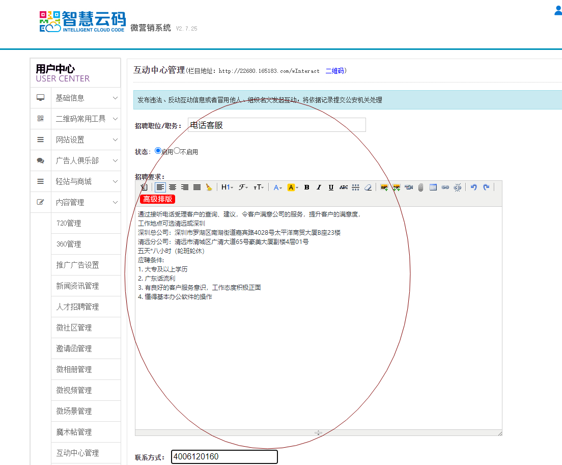 2、在彈出的活動類型當(dāng)中選擇所需的項目進行添加。如發(fā)布招聘:招聘職位/職務(wù)、招聘要求、聯(lián)系方式按實際情況填寫,如下圖所示: