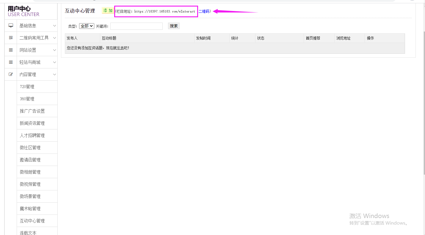 互動中心是給到微官網(wǎng)當(dāng)中的終端客戶使用的,在微官網(wǎng)首頁上不能直接看到該欄目。需要先把互動中心的鏈接地址添加至微官網(wǎng)欄目地址或微信公眾號的自定義菜單當(dāng)中。