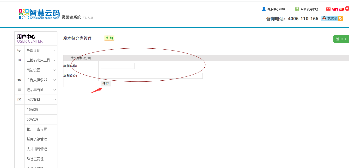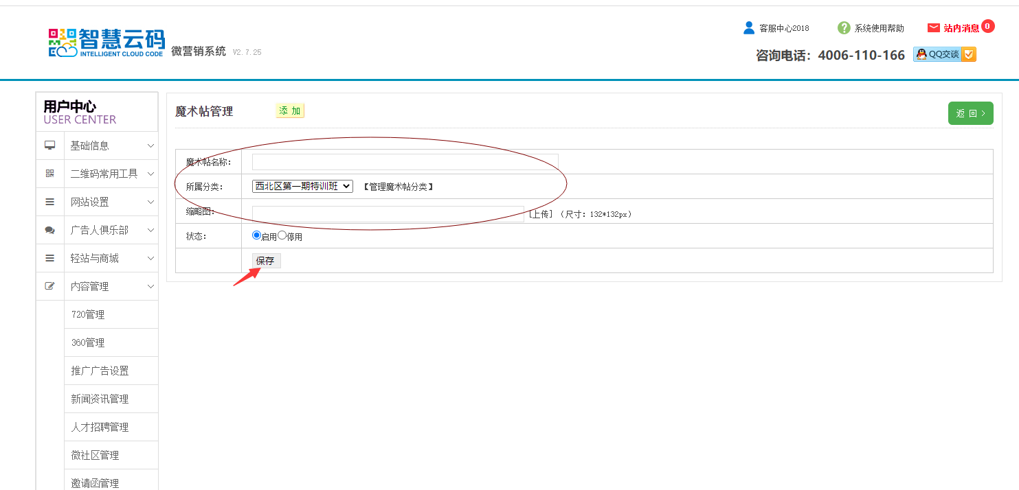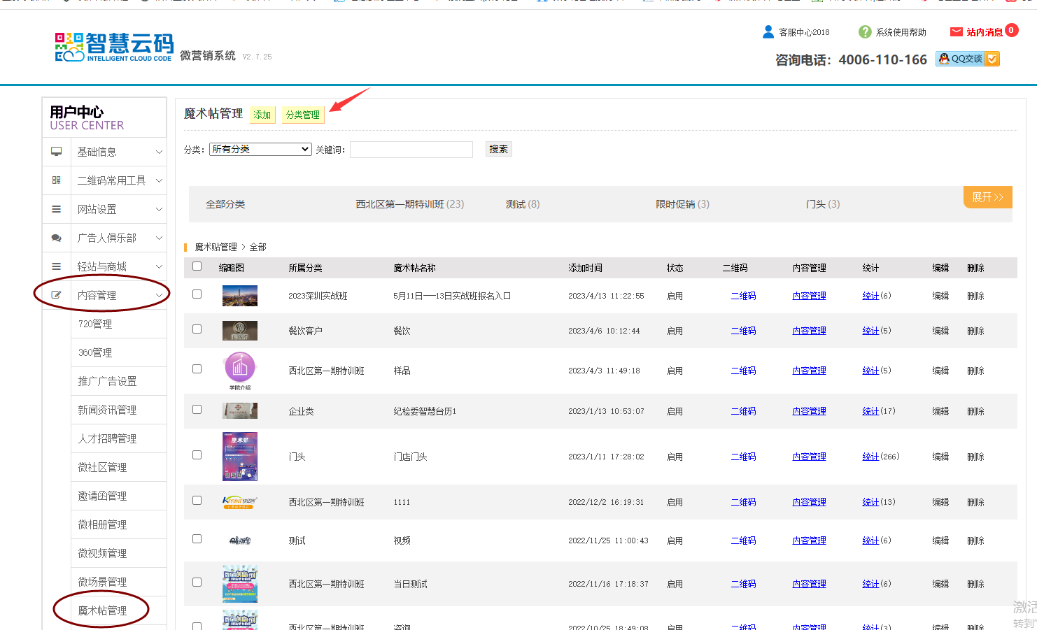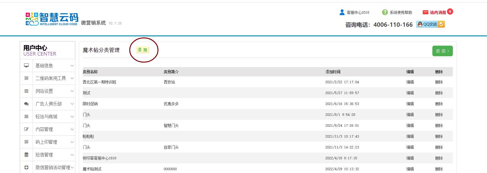 1、首先登陸智慧云碼系統(tǒng),找到內(nèi)容管理欄目,點擊魔術(shù)貼管理,點擊添加,如下圖所示: