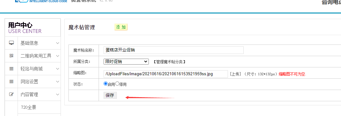 4、魔術(shù)貼名稱按實際情況填寫;所屬分類按實際情況選擇;縮略圖建議上傳與促銷內(nèi)容相關(guān)的圖片,格式為JPG/PNG,推薦尺寸為:132*132px;狀態(tài)選擇啟用;以上信息填寫完畢后,點擊保存。如下圖所示: