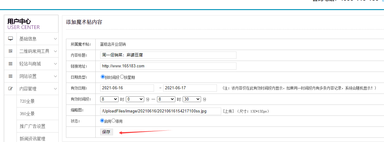 如下圖所示,當(dāng)中選擇的有效日期是星期一,有限時間段是0時0分-23時59分(意思為:麻婆豆腐在星期一整天生效),時間必須要設(shè)置,不能直接按照原始默認時間保存,二維碼內(nèi)容會掃不出來;縮略圖格式為JPG/PNG,尺寸為132*132px;狀態(tài)選為啟用。以上信息設(shè)置完畢后,點擊保存即可,如下圖: