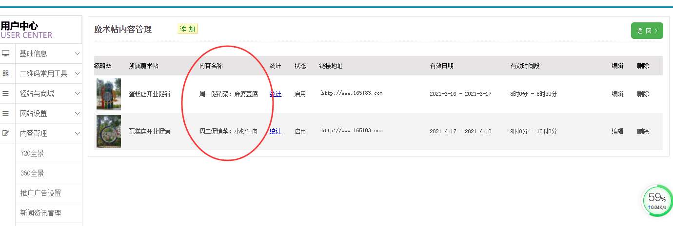 在彈出的頁面完善相應(yīng)信息:所屬魔術(shù)貼為固定項,不用修改;內(nèi)容標(biāo)題按實際情況填寫,如填寫成周一促銷菜--麻婆豆腐;則鏈接地址應(yīng)當(dāng)填寫麻婆豆腐的鏈接地址(如果麻婆豆腐沒有對應(yīng)的鏈接地址,請先在輕站2.0的商品管理--產(chǎn)品管理當(dāng)中添加商品,把麻婆豆腐相關(guān)內(nèi)容上傳,上傳完畢后,會生成其對應(yīng)的鏈接;或是其他功能板塊里先做好再復(fù)制鏈接地址進來即可,外鏈也可);日期類型可選擇按時間段或按星期;有效時間段是跟有限日期配套設(shè)置的,注意,有效日期設(shè)置后該內(nèi)容僅在此有效時間段內(nèi)顯示,如果同一時間段內(nèi)有多條內(nèi)容記錄,系統(tǒng)會隨機顯示!