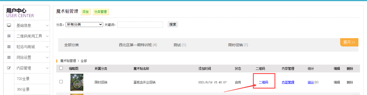 6、多個內(nèi)容設(shè)置完畢后,返回魔術(shù)貼管理列表,點擊二維碼,可掃碼體驗,或把二維碼印在印刷品上均可;點擊“統(tǒng)計”如下圖所示: