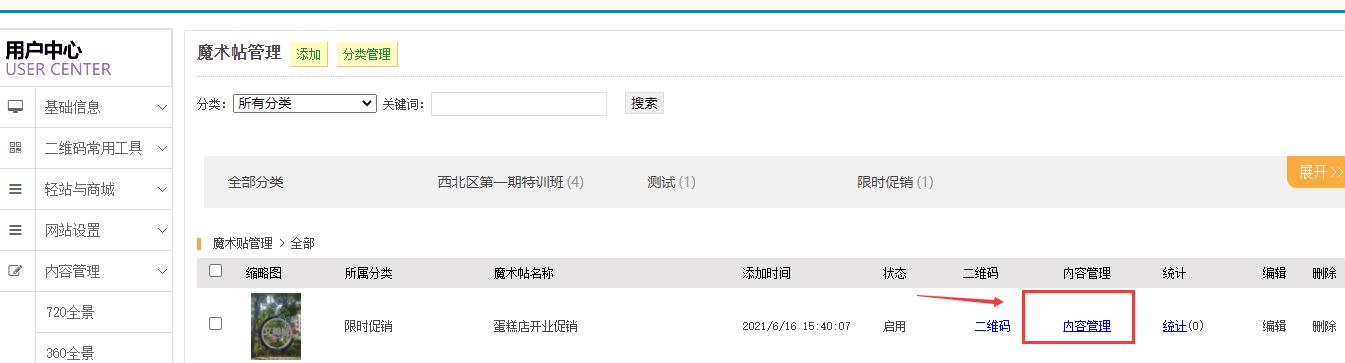 5、點擊內(nèi)容管理,去完善該魔術(shù)貼的內(nèi)容。如下圖所示: