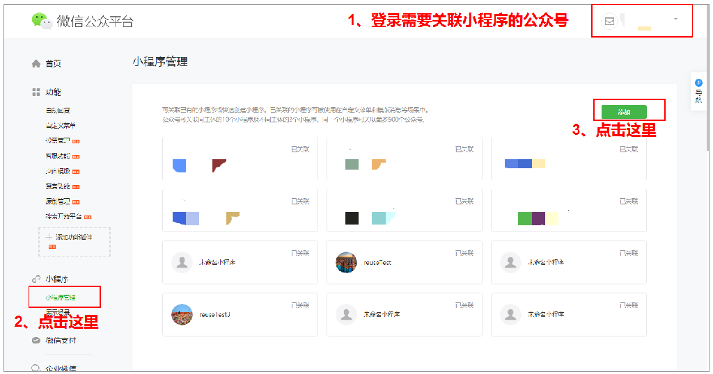 一、登錄需要關聯小程序的微信公眾號后臺,在左側找到“小程序”-“小程序管理”,然后點擊“添加”按鈕。