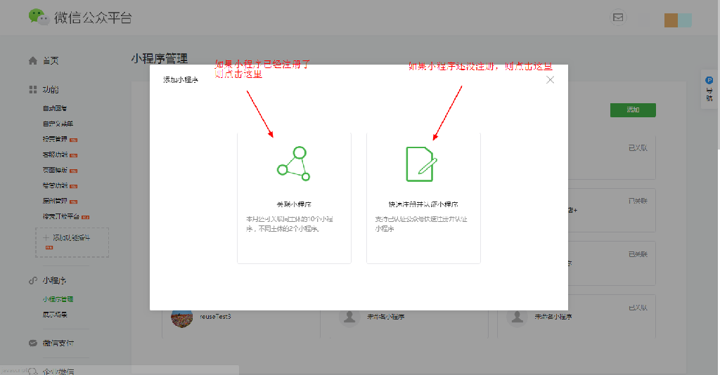 二、如果已經有注冊好的小程序,就點擊“關聯小程序”。如果沒有注冊好的小程序,就點擊“快速注冊并認證小程序”。