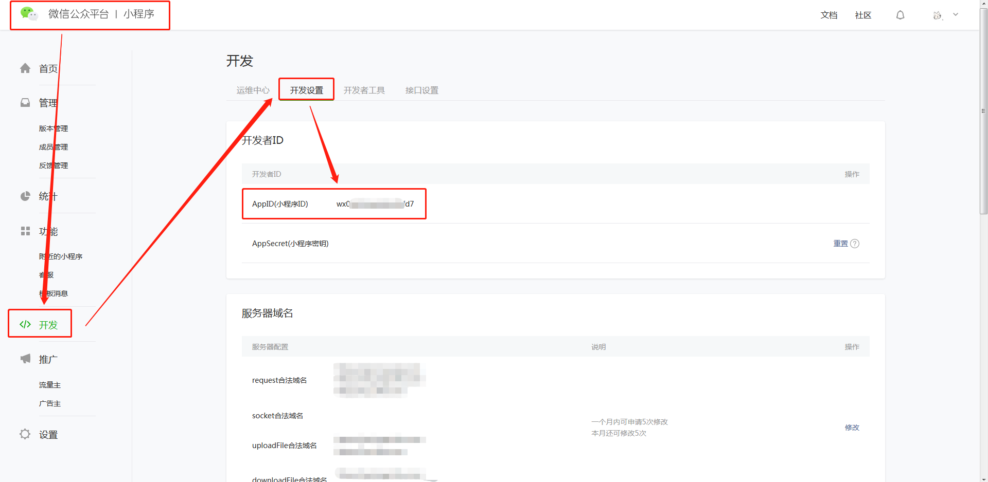首先我們登錄微信小程序管理后臺,點擊“開發”-“開發設置”,在“開發者ID”下找到AppID,也就是小程序ID。