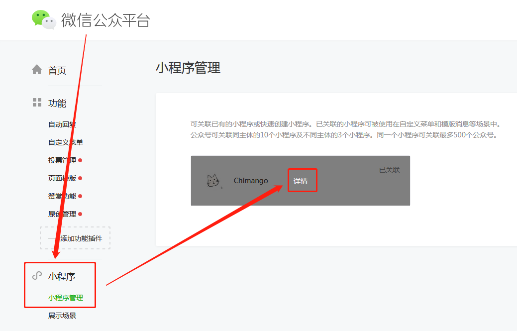 1、我們先登錄要解除關聯的微信公眾號后臺,進入“小程序”-“小程序管理”,選擇要解除關聯的小程序,點擊“詳情”。(注意:這里登錄的是微信公眾號的后臺,不是登錄微信小程序的后臺!)