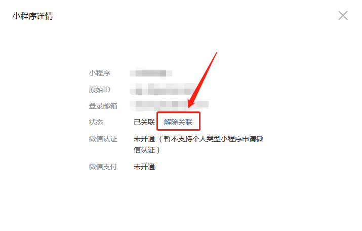 2、在小程序詳情頁面,點擊“解除關聯”。