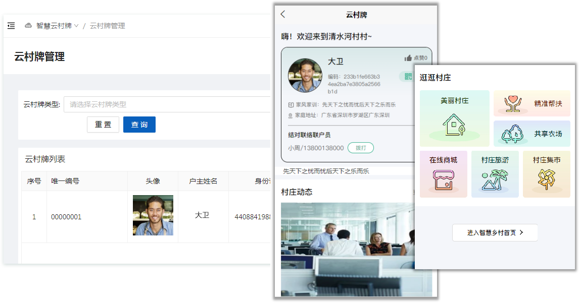 智慧云村牌是村民、消費者、信息平臺連接的渠道。鄉村村牌智能化,以家庭為單位推進數字鄉村治理。協同互動,實現村莊集體信息化數據壁壘。云村牌是全面推進鄉村宣傳推廣的前線陣地。