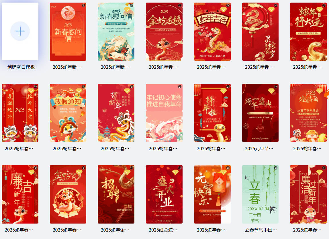 我們推出了334套精心設計的全新模板,宛如璀璨繁星,點亮您的宣傳之路。無論是熱鬧喜慶的新春促銷活動,還是溫馨感人的節日祝福傳遞,亦或是別出心裁的企業年會展示,在這里,您都能找到最契合心意的那一款。每一套模板都經過匠心雕琢,融入傳統春節元素與現代設計理念,從喜慶的中國紅到靈動的金蛇圖案,從精美的剪紙藝術到充滿科技感的動態特效,讓您的宣傳內容在眾多信息中脫穎而出,瞬間抓住受眾目光。
