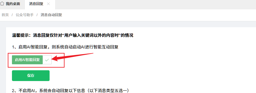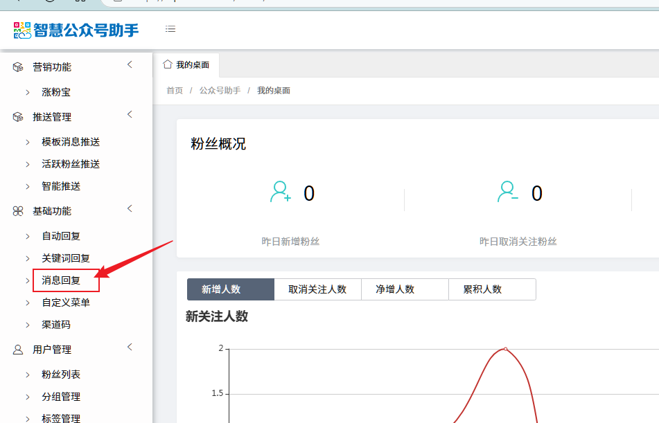 登陸智慧公眾號助手,找到“消息回復”菜單:
