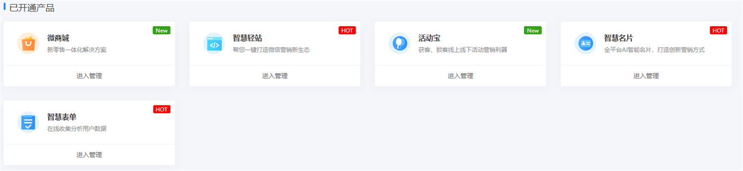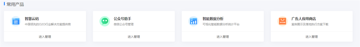 用戶登陸時,默認進入企業(yè)中心,企業(yè)中心以版塊形式,羅列出智慧云碼所有功能版塊,并按 常用產品、已開通產品、未開通產品 為分類展示。