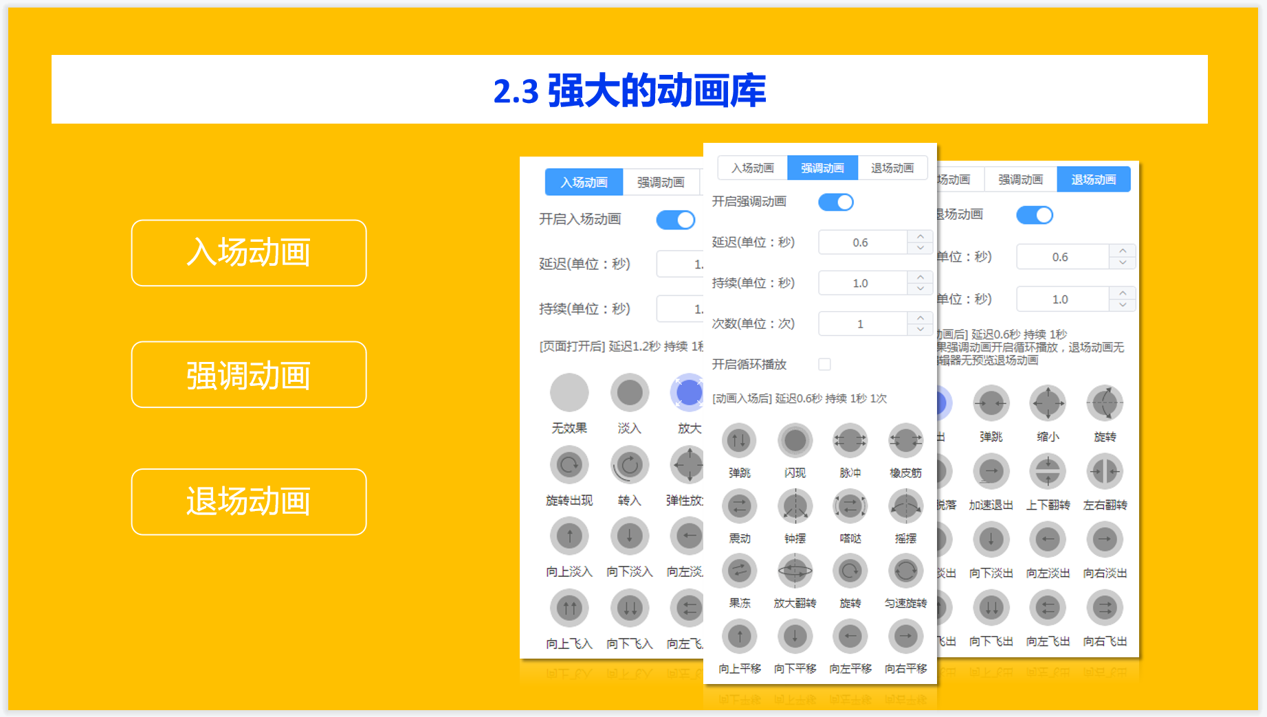 微場景V2.0版,提供強大的動畫設(shè)計功能,支持入場動畫、強調(diào)動畫、退場動畫 等合計近100種動畫效果