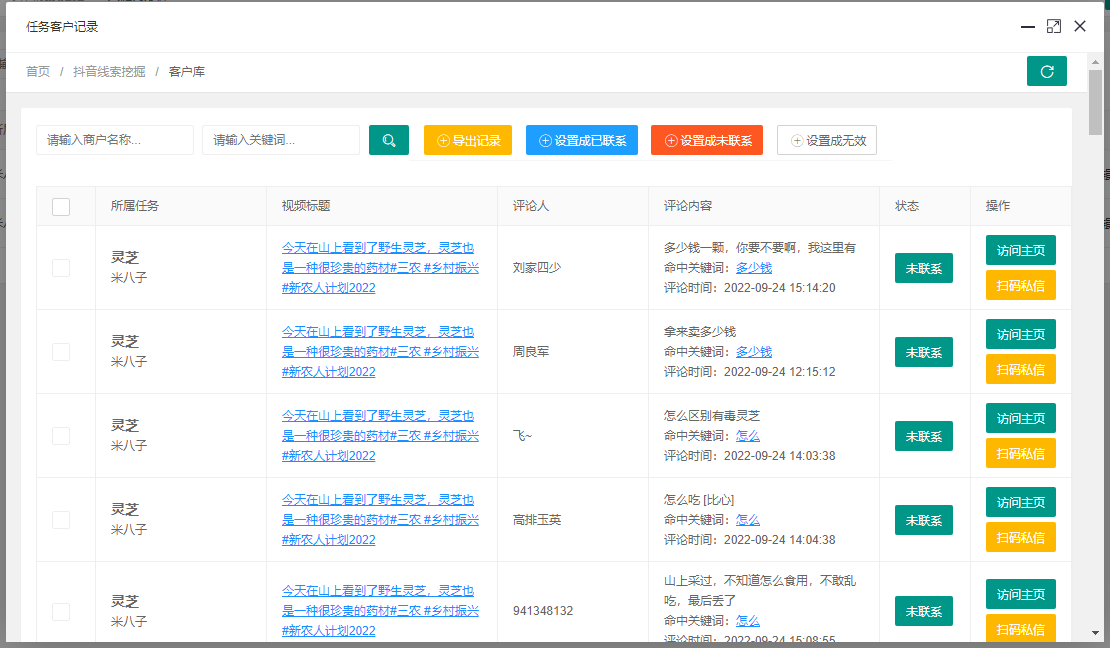 全新上全線索自動挖掘系統(tǒng),設(shè)置一個關(guān)鍵詞,系統(tǒng)即自動從抖音挖掘線索,搜索并識別意向客戶。