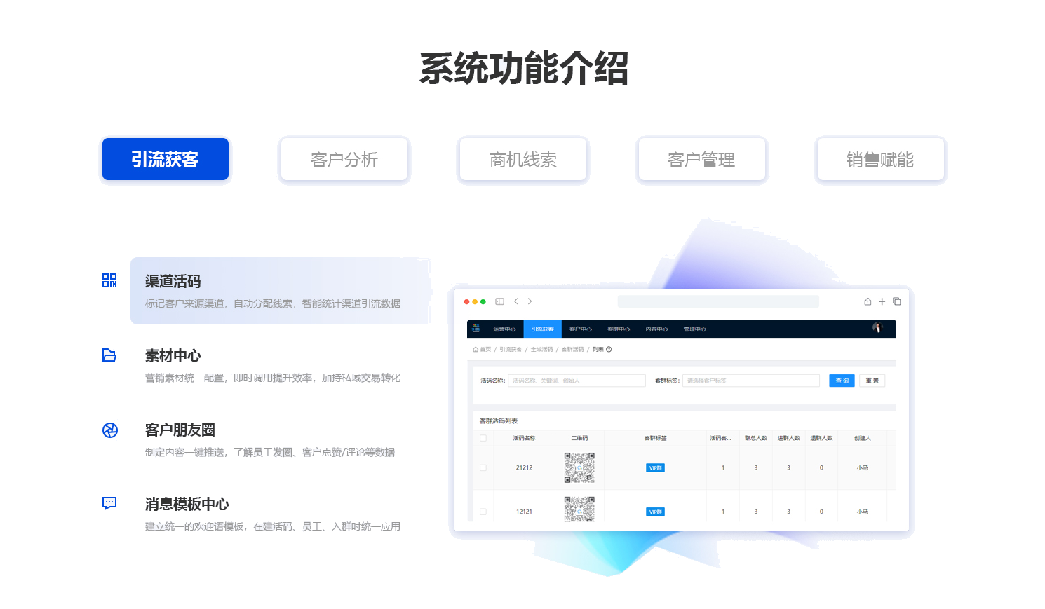 1、引流獲客:渠道活碼、素材中心、客戶朋友圈、消息模板