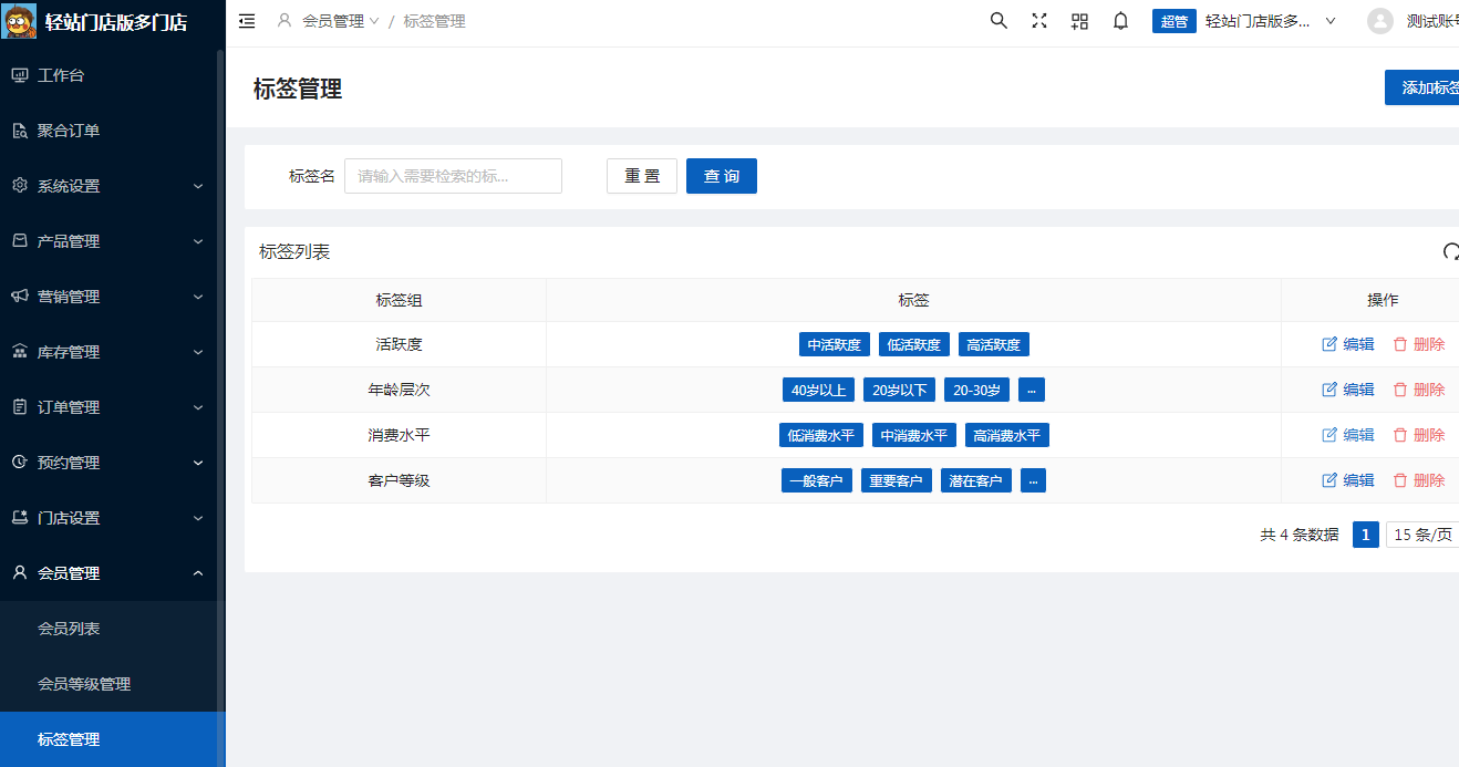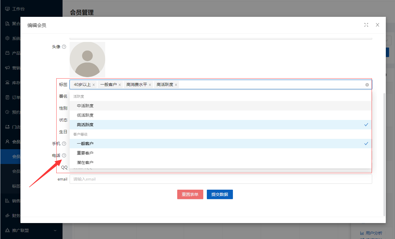 在會員管理時,編輯會員資料可以給不同的會員設置不同的標簽,通過標簽對客戶分組,可以使用標簽對客戶進行篩選,細化會員管理。