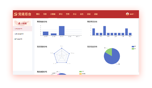 大數據分析平臺主要是將黨員和黨組織相關工作或活動信息以圖表的形式進行數據展現。此模塊主要是對黨組織、黨員、群眾反饋等相關信息進行數據整合、分析和展示,它的優點是快速的向用戶傳遞信息,讓用戶一目了然,對黨建工作及時做出決策。