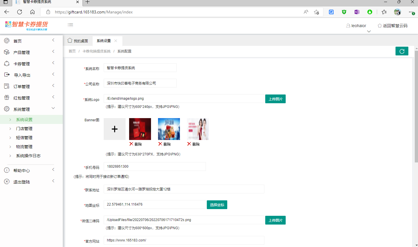 系統(tǒng)設(shè)置主要為設(shè)置系統(tǒng)名稱、LOGO、聯(lián)系方式 以及 系統(tǒng)紅包的名稱、兌換須知等基本資料。如下所示: