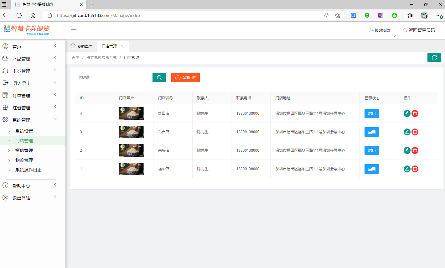 門店管理為設(shè)置可供用戶線下上門提貨的門店地址及聯(lián)系方式,系統(tǒng)支持多門店添加。如圖示為門店列表;如下所示: