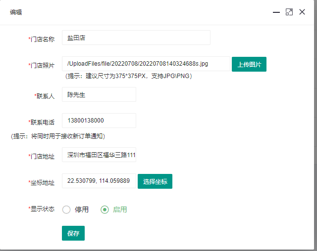 添加添加門店或編輯,可添加或修改門店資料。如下所示: