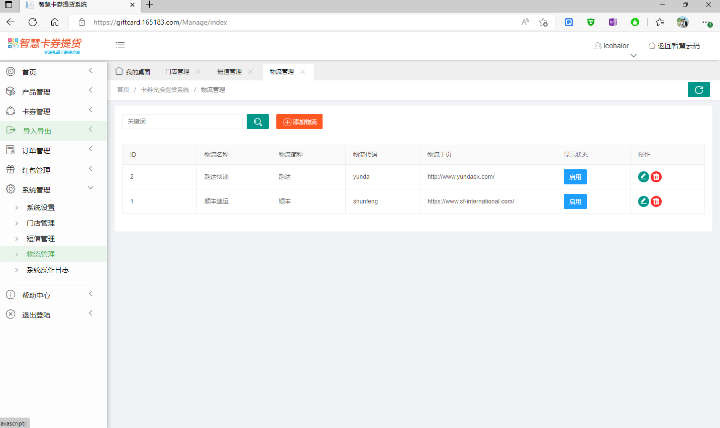 物流管理為錄入系統(tǒng)所支持的快遞方式,當(dāng)用戶選擇線上提貨時(shí),可從所支持的快遞方式中選擇合適的方式進(jìn)行發(fā)貨。