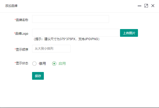 產(chǎn)品品牌設(shè)置中,點(diǎn)擊【添加品牌】。輸入品牌名稱等字段,點(diǎn)擊【保存】按鈕,提交后成功創(chuàng)建新的產(chǎn)品品牌。如下圖所示: