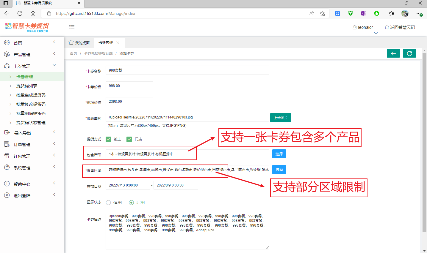 通常情況下,商家可以發(fā)布多種不同規(guī)格的卡券,如禮品卡,可發(fā)行白金卡、金卡、VIP卡,大閘蟹可發(fā)行2388套餐、3888套餐、5888套外等,在智慧卡券提貨中,不同卡券或套餐,就是通過(guò) 卡券管理來(lái)實(shí)現(xiàn)。