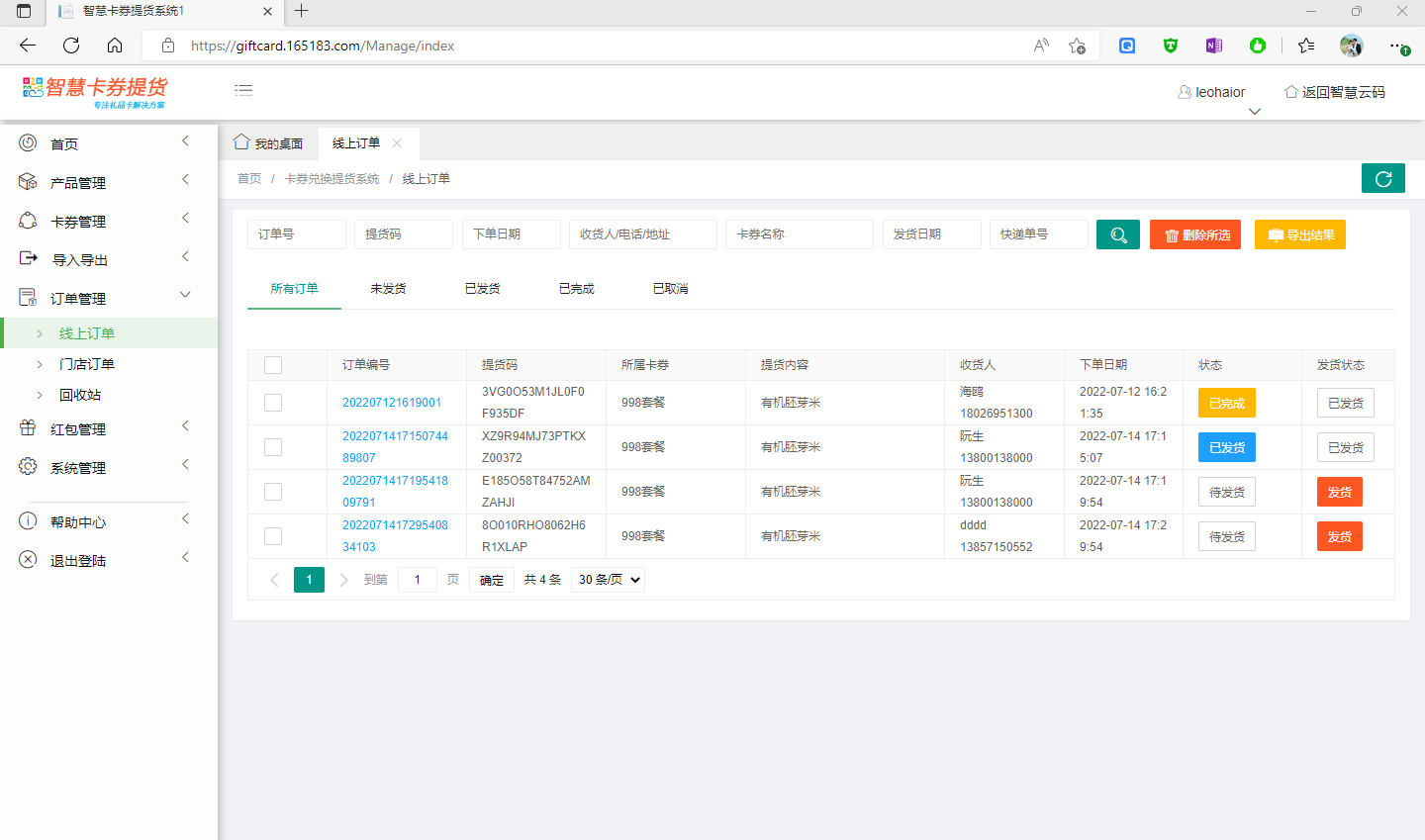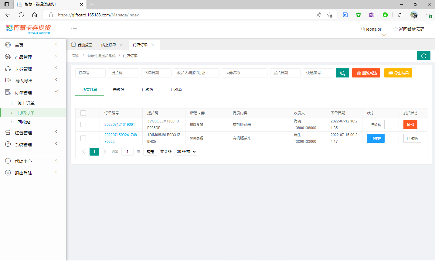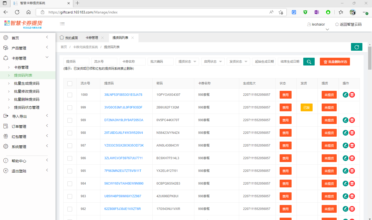 此處可查看所有系統(tǒng)中的提貨碼及密碼、所屬卡券、批 以及啟用狀態(tài)、發(fā)貨狀態(tài)、是否已提貨等。對(duì)于未被提貨的提貨碼,系統(tǒng)支持批量刪除。如下圖所示: