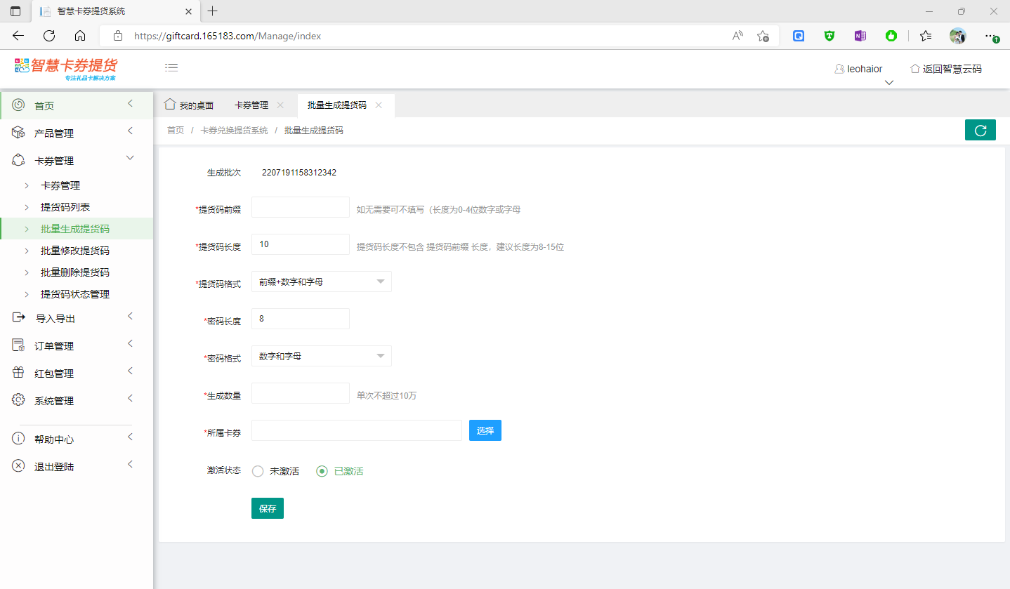 一般卡券都是大規(guī)模發(fā)布,一張卡券中可包含萬(wàn)百上千甚至幾萬(wàn)幾十萬(wàn)的提貨卡,因此,系統(tǒng)中提貨碼的生成,采用后臺(tái)批量自動(dòng)生成的方式。商家在批量生成提貨碼功能中,設(shè)置要生成的提貨碼前綴、提貨碼長(zhǎng)度、格式,密碼長(zhǎng)度、格式,生成數(shù)量 以及 所屬卡券,點(diǎn)擊保存,即可等待系統(tǒng)在后臺(tái)自動(dòng)生成該批次的提貨碼。如下圖所示: