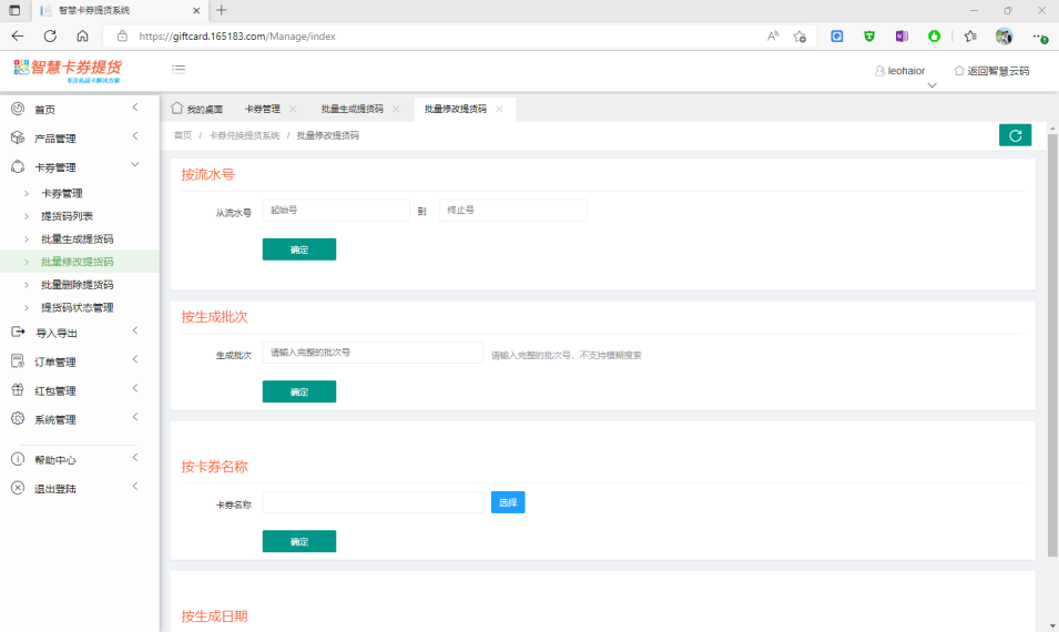 同樣,為支持批量大規(guī)模提貨碼,系統(tǒng)中,修改、刪除提貨碼,及提貨碼狀態(tài)管理等,均采用批量操作的方式。在修改提貨碼時(shí),可通過(guò)流水號(hào)段、生成批次、卡券名稱、生成日期等4種條件,篩選需要修改的提貨碼,如下圖所示: