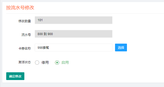 設(shè)置條件后,點(diǎn)確定,即可進(jìn)入批量修改界面,修改主要包含切換所屬卡券、更改狀態(tài)等。如下圖所示: