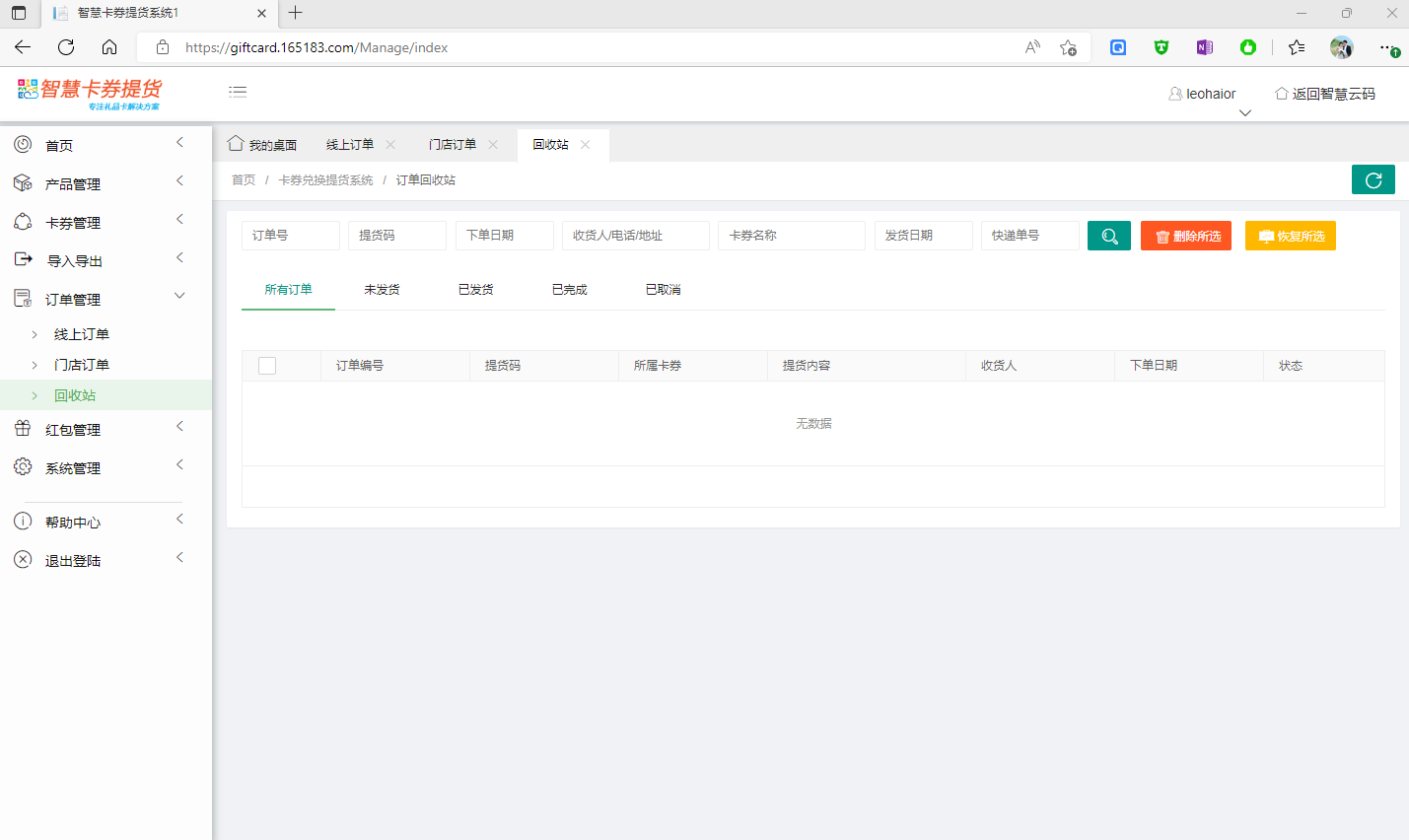 線上訂單及門店訂單中,有批量刪除訂單功能,但不會(huì)直接徹底刪除訂單,而是將訂單刪除至回收站中,用戶可以在回收站中,選擇恢復(fù)訂單或徹底刪除訂單。如下圖所示: