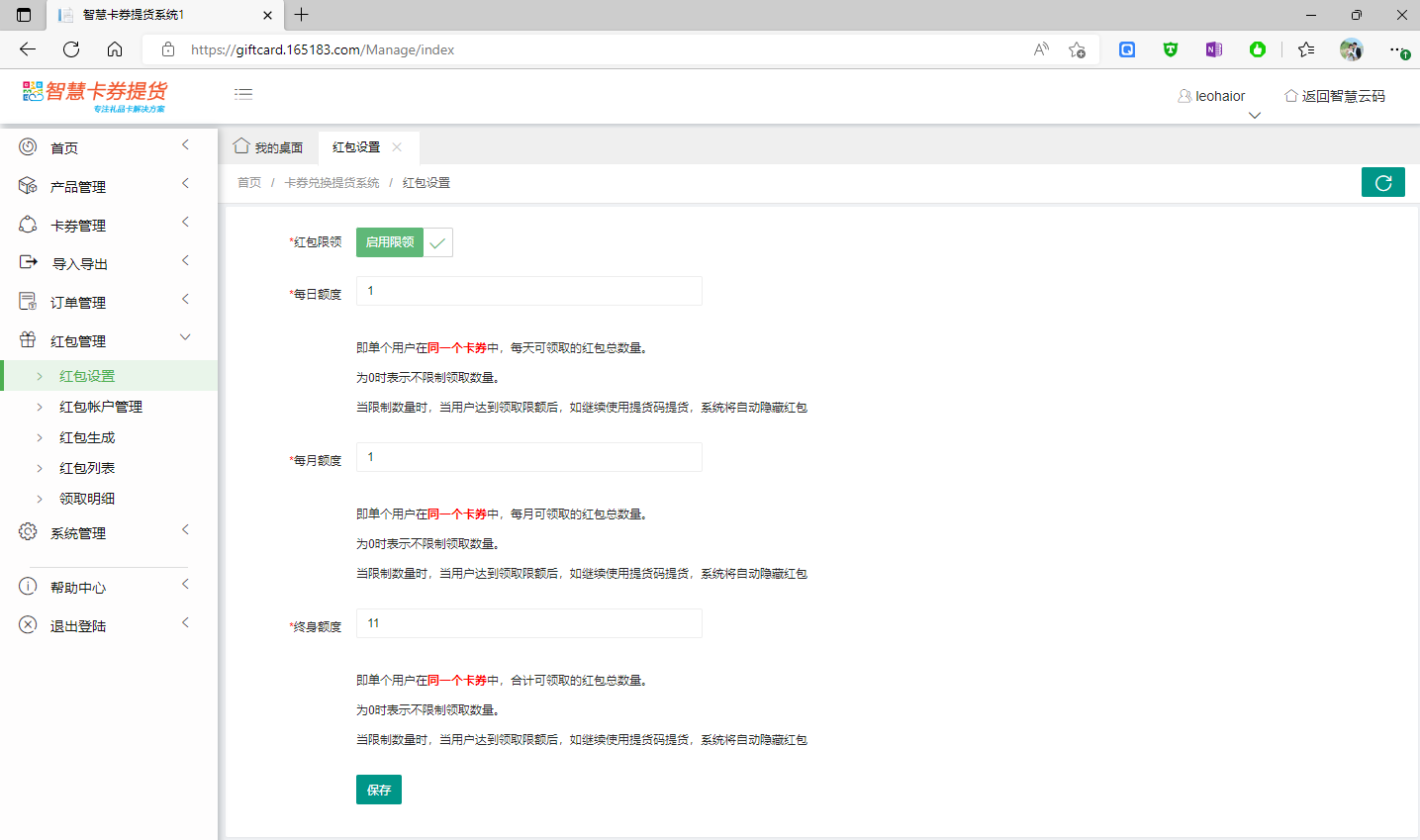 啟用紅包功能前,需要先在紅包設(shè)置中,設(shè)置紅包的領(lǐng)取限制及額度,系統(tǒng)支持 每日限額,每月限額、終身限額三種;如下圖所示: