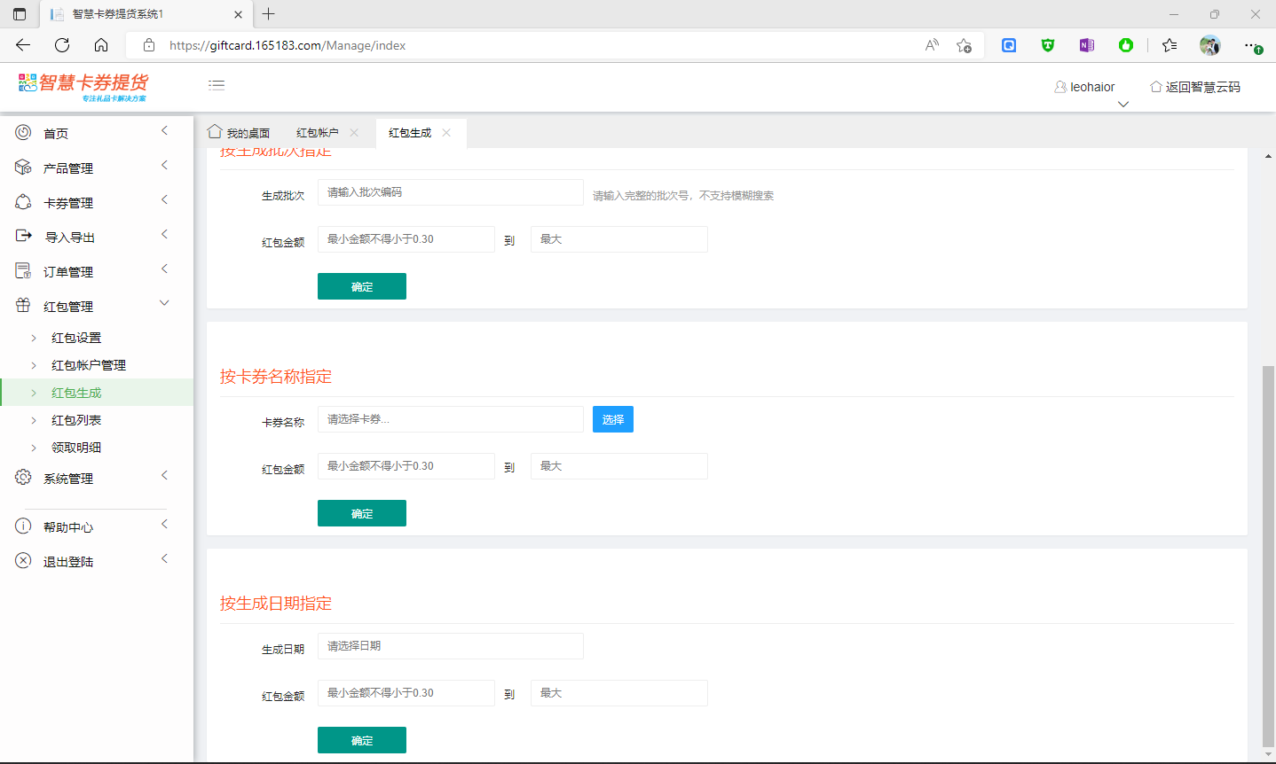 生成紅包時(shí),系統(tǒng)支持通過(guò)流水號(hào)段、生成批次、卡券名稱、生成日期等4種條件,進(jìn)行批量生成,設(shè)置紅包生成條件,并設(shè)置紅包金額區(qū)間,點(diǎn)擊確定,系統(tǒng)則自動(dòng)進(jìn)行紅包分配。如下圖所示: