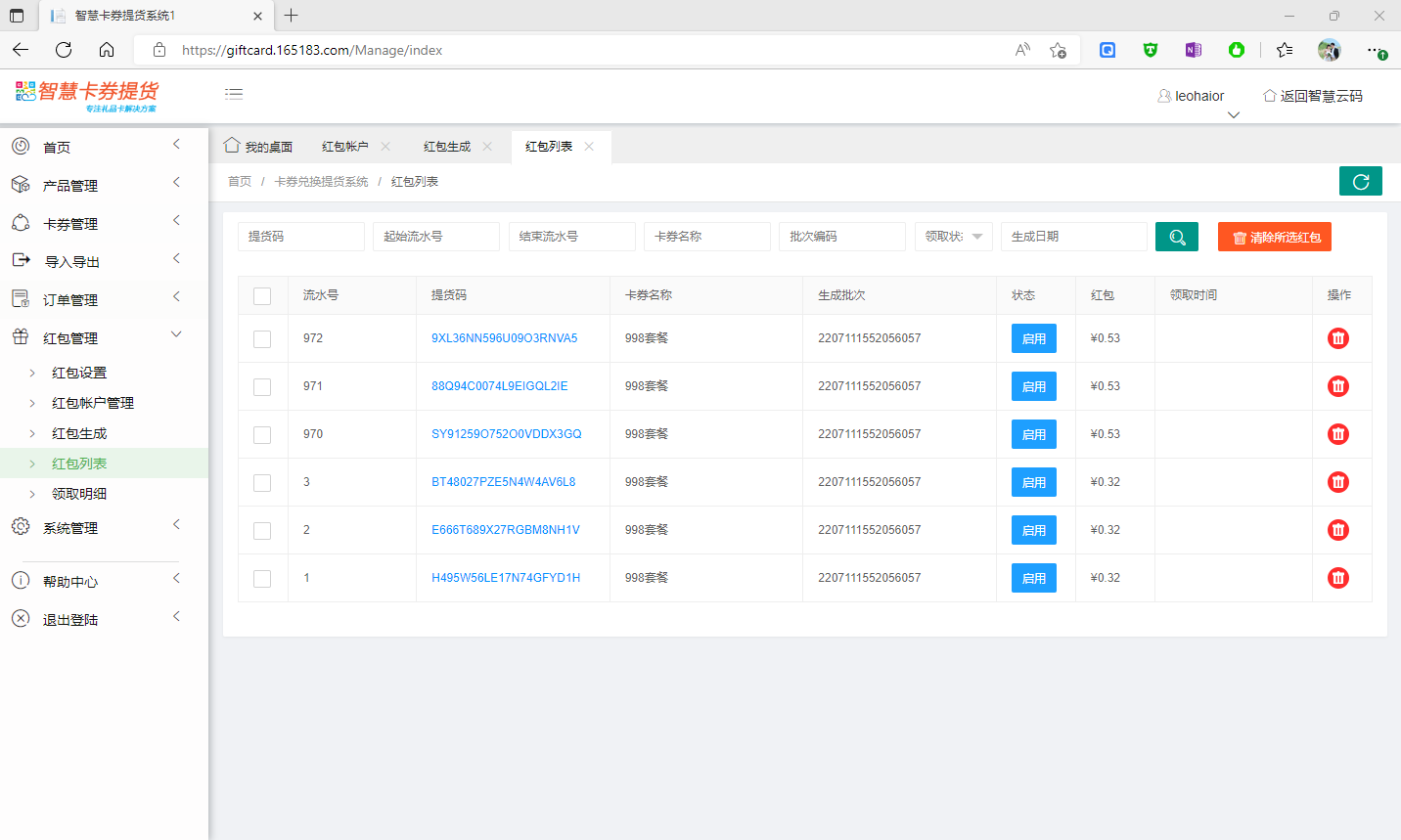 所有含有紅包的提貨碼,均會(huì)出現(xiàn)在紅包列表功能中。商家可以在此,對(duì)部分不需要的提貨碼,進(jìn)行清除紅包操作。如下圖所示: