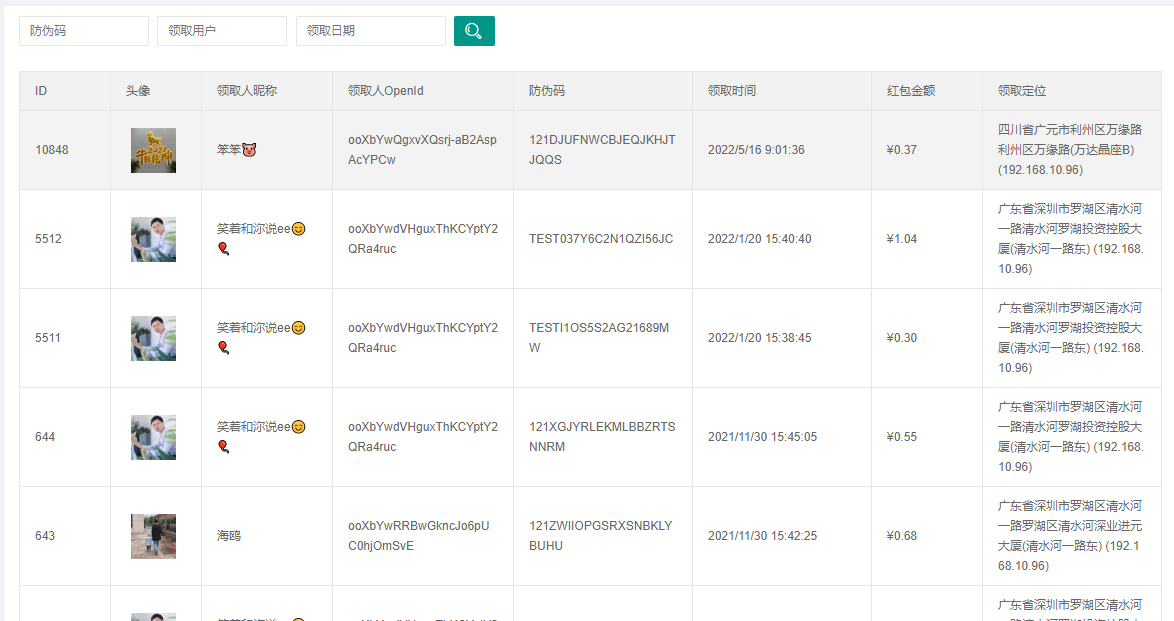 紅包領(lǐng)取明細(xì)主要是用來(lái)展示領(lǐng)取紅包的用戶詳細(xì)信息。包括用戶姓名,領(lǐng)取時(shí)間,具體地理位置等。如下圖所示: