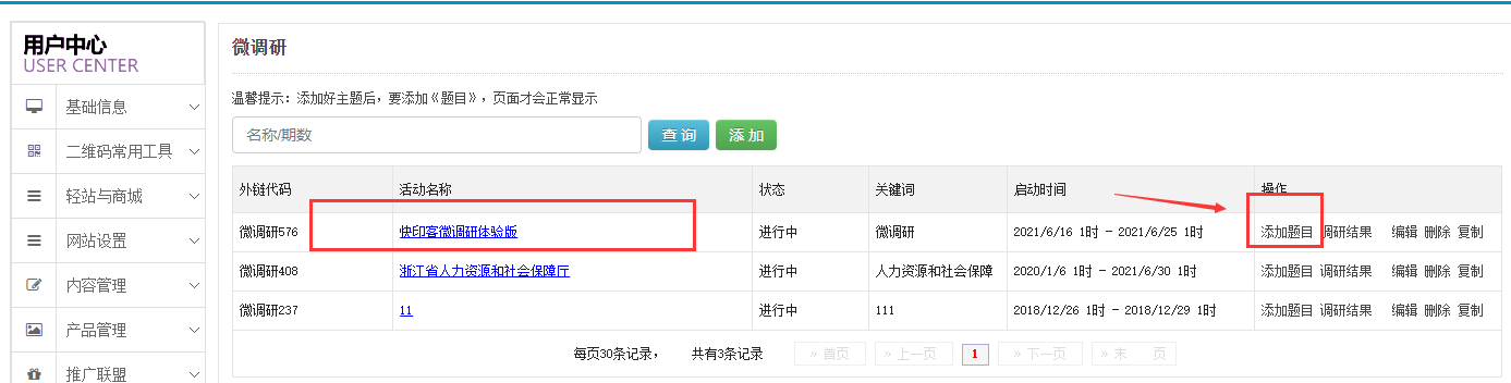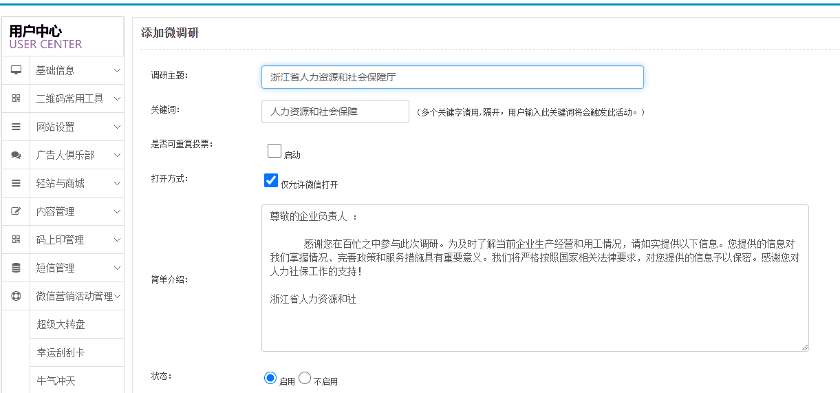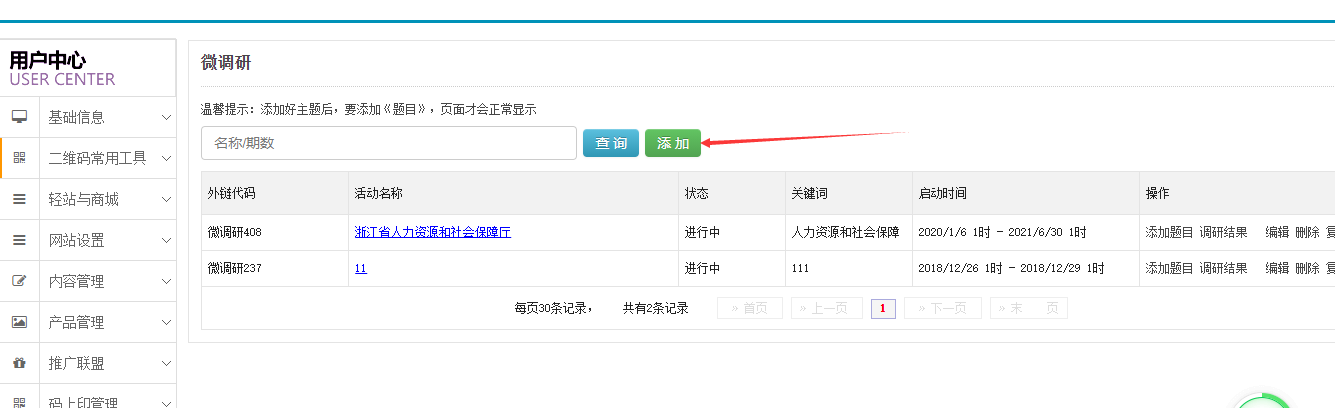 1、登錄智慧云碼系統,點擊微信營銷活動管理--微調研,點擊添加,如下圖: