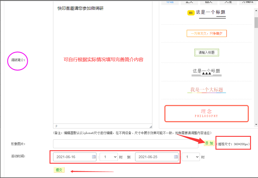 簡單介紹按實際情況填寫;調研簡介按實際情況填寫;形象圖片格式為JPG/PNG,推薦尺寸為360*200px;活動時間按實際情況填寫。以上信息設置完畢后,點擊提交,如下圖所示: