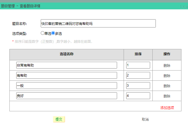題目名稱按實際情況填寫;選項類型可以選擇單選或多選。設置完畢后,點擊提交,如下圖: