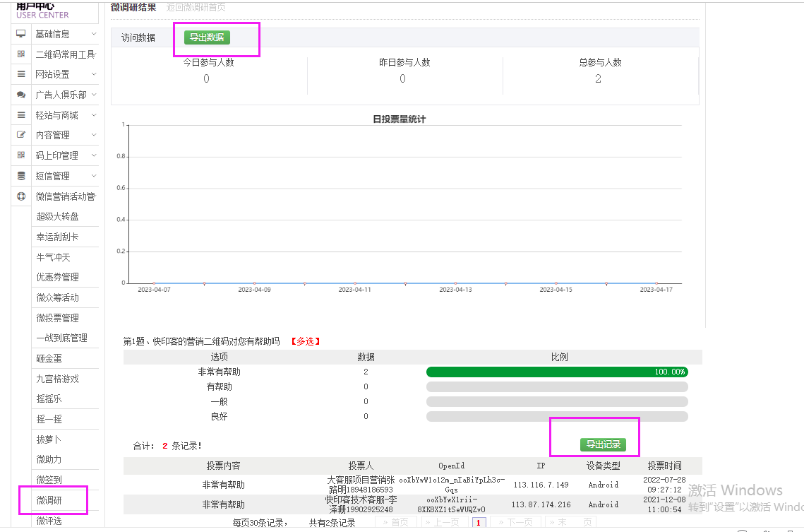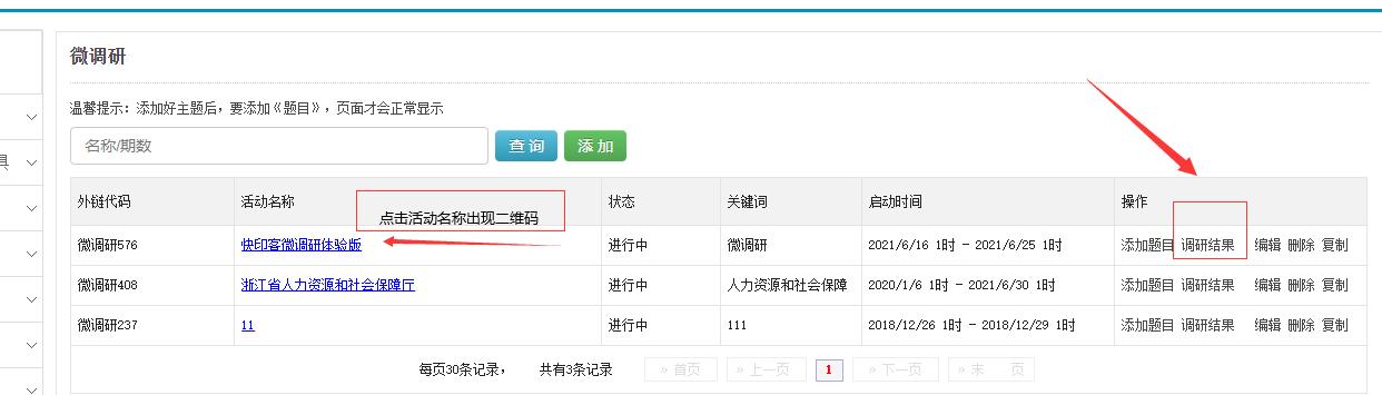 4、如果所有題目都設置完畢后,返回微調研類別界面,可直接點擊游戲名稱查看二維碼,掃碼參與該活動;后期需要查看投票信息,可點擊投票結果查看,也可把數據導出。如下圖所示: